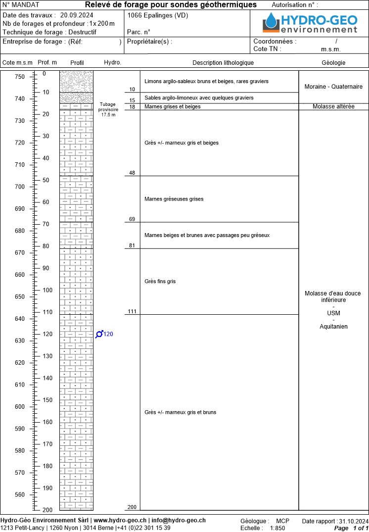 - Lithologie : Description des couches traversées (épaisseurs, types de matériaux).